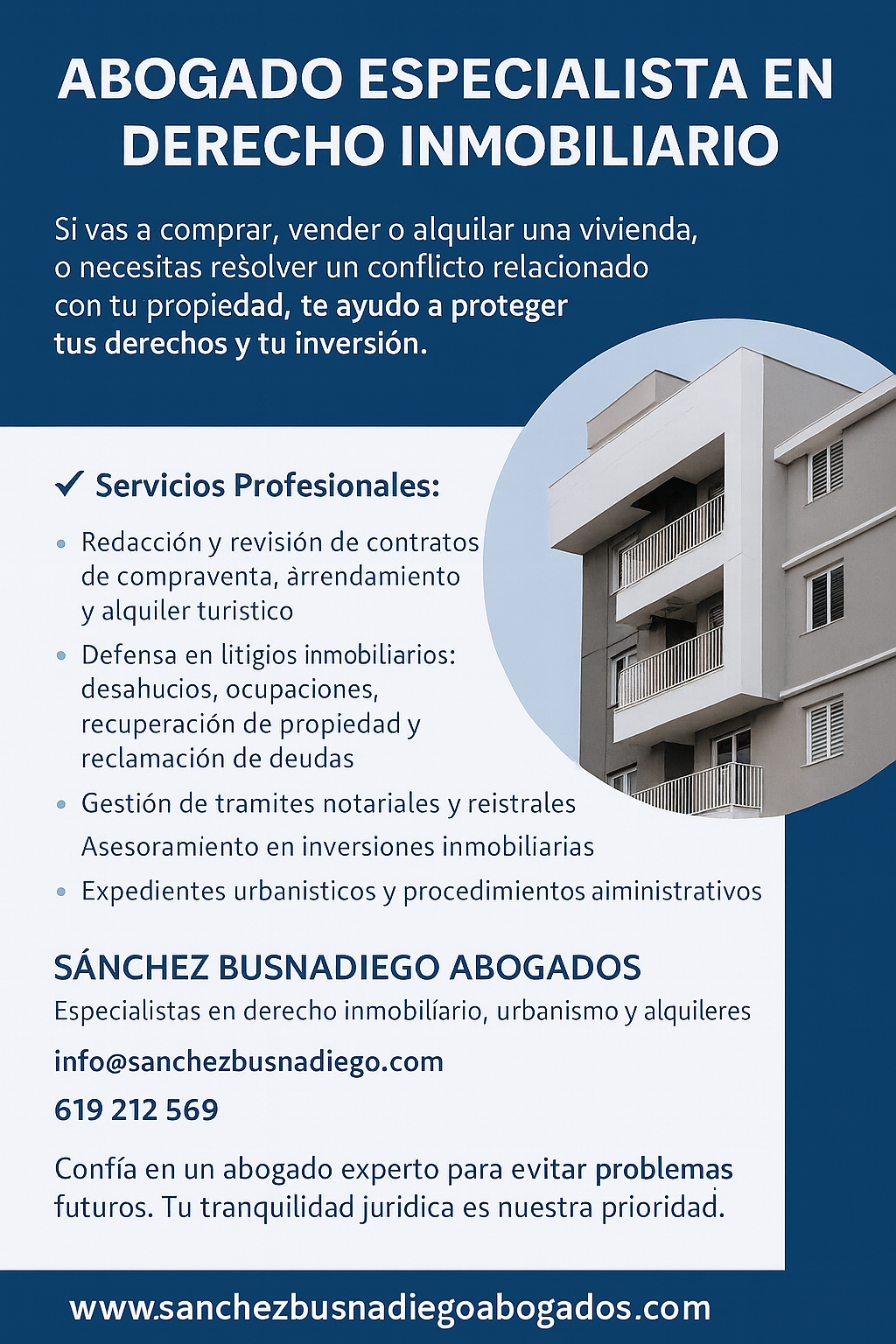 En MALAGA. Abogado especialista en derecho Inmobiliario.Si vas a comprar, vender o alquilar una vivienda, o necesitas resolver un conflicto relacionado con tu propiedad, te ayudo a proteger tus derechos y tu inversión. ✔️ Servicios Profesionales: 🔹 Redacción y revisión de contratos de compraventa, arrendamiento y alquiler turístico 🔹 Defensa en litigios inmobiliarios: desahucios, ocupaciones, recuperación de propiedad y reclamación de deudas 🔹 Gestión de trámites notariales y registrales 🔹 Asesoramiento en inversiones inmobiliarias 🔹 Expedientes urbanísticos y procedimientos administrativos 🧑⚖️ SÁNCHEZ BUSNADIEGO ABOGADOS Especialistas en derecho inmobiliario, compraventa, alquileres, urbanismo, desahucios, ocupaciones, trámites notariales y registrales. 🌐 www.abogadosanchezbusnadiegoabogados.com 📞 619 212 569