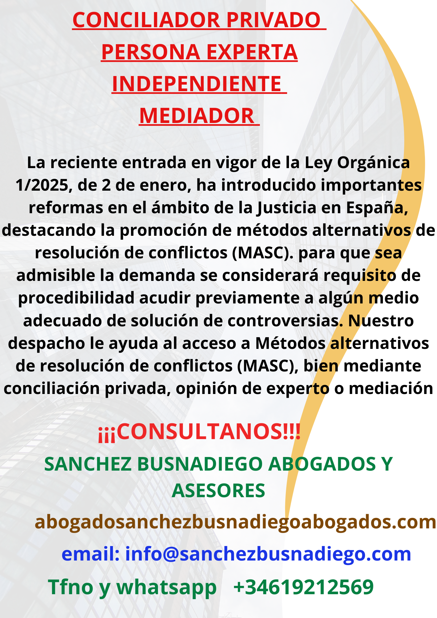 CONCILIADOR PRIVADO- OPINIÓN PERSONA EXPERTA INDEPENDIENTE - MEDIADOR en Benalmádena (MALAGA). La reciente entrada en vigor de la Ley Orgánica 1/2025, de 2 de enero, ha introducido importantes reformas en el ámbito de la Justicia en España, destacando la promoción de métodos alternativos de resolución de conflictos (MASC), En el orden jurisdiccional civil, con carácter general, para que sea admisible la demanda se considerará requisito de procedibilidad acudir previamente a algún medio adecuado de solución de controversias como la mediación, conciliación privada u opinión de persona experta independiente (art. 5)